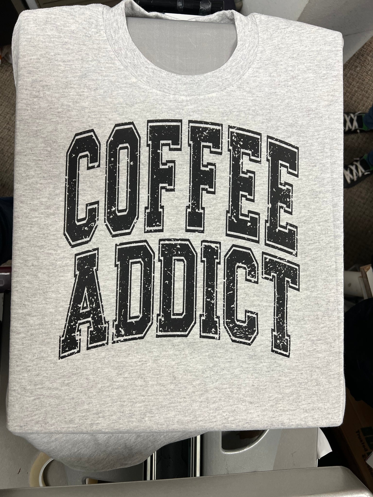Coffee Addict printed on a GILDAN soft style sweatshirt ash gray in color